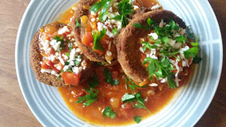 Vinetele le-am dat intai prin faina si apoi prin ou si pesmet.Nu am turnat sosul peste ele, pt. ca nu ar mai fi ramas crocante si nu mi-ar fi placut.In loc de cascaval care e foarte bun cand sunt calde am pus telemea de capra, ca am berechet.Vezi reteta daca vrei/ai lapte sa o faci.In plus a doua zi cascavalul nu mai era bun rece.Zaharul nu era dat in reteta, dar cand folosesc rosii eu il pun.